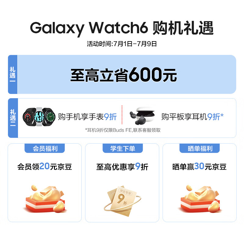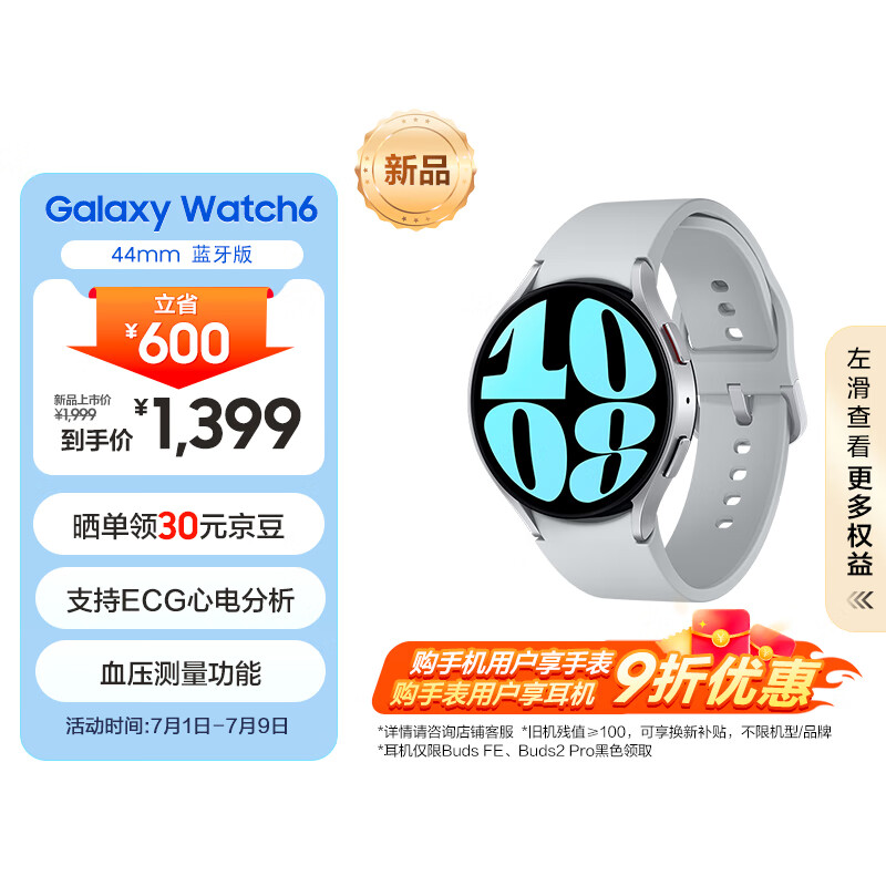 三星Galaxy Watch6 蓝牙通话/智能手表/运动电话手表/ECG心电分析/血压手表/健康监测 44mm 星系银价格:1399.00元!