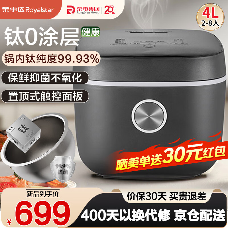 荣事达(Royalstar)纯钛零涂层电饭煲 家用3-4个人 多功能一体家用 无涂层内胆一键柴火饭高端节日送礼佳品RFB-S4088T价格:699.00元!