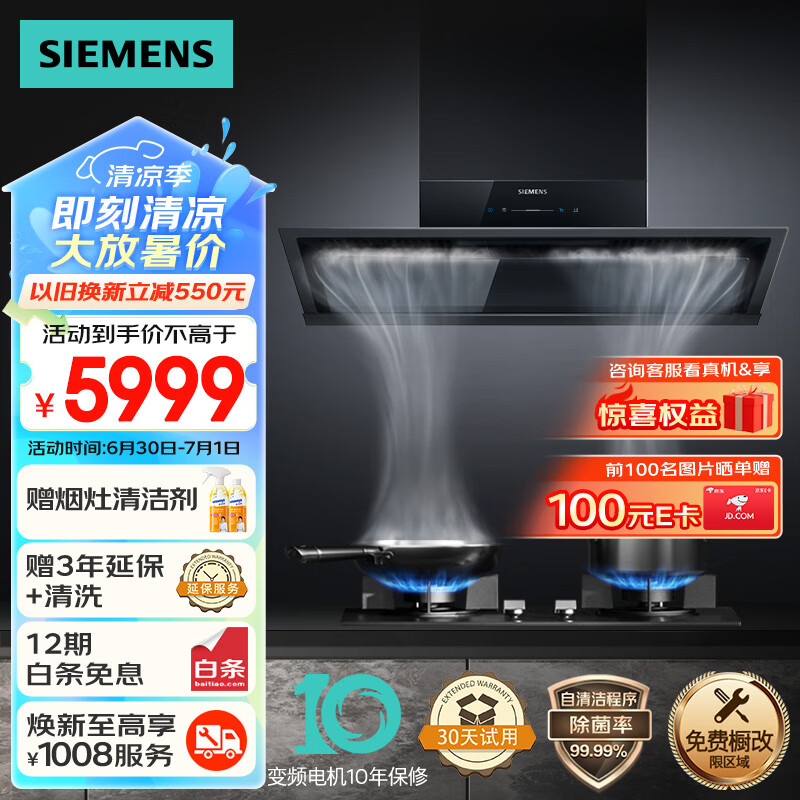 西门子(SIEMENS)锥锋速吸油烟机灶具套装23m3/min超薄侧吸抽油烟机自清洁5.0kW燃气灶LSVT1B3BNW烟灶套装天然气价格:5999.00元!