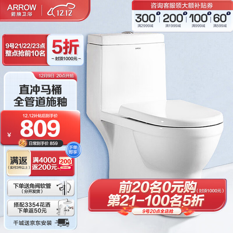 箭牌(ARROW)马桶家用直冲式坐便器大冲力座便坐厕 1级水效 全管施釉AEB12601T价格:1159.00元!
