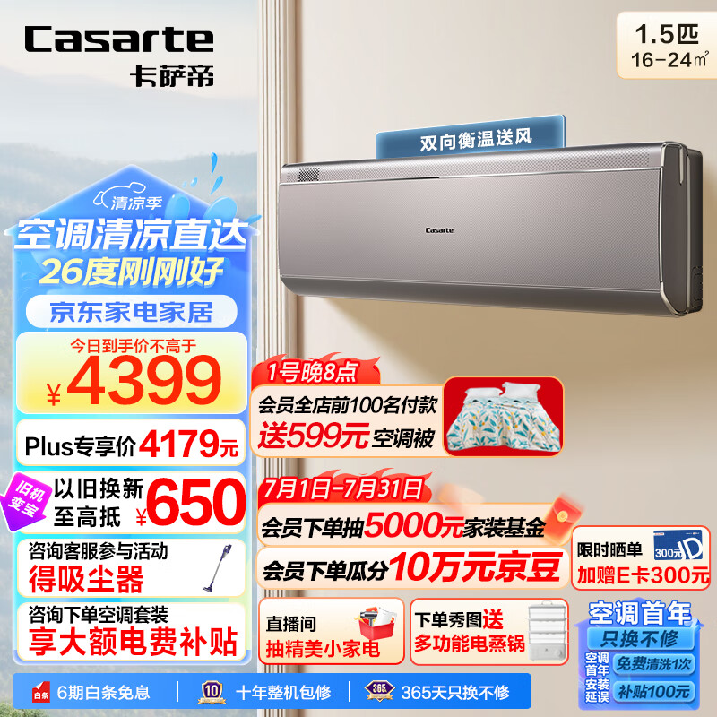 卡萨帝(Casarte) 1.5匹 名匠 双向衡温送风 壁挂式空调挂机 一级能效 智能变频 卧室CAS3512FCA(81)U1价格:4399.00元!