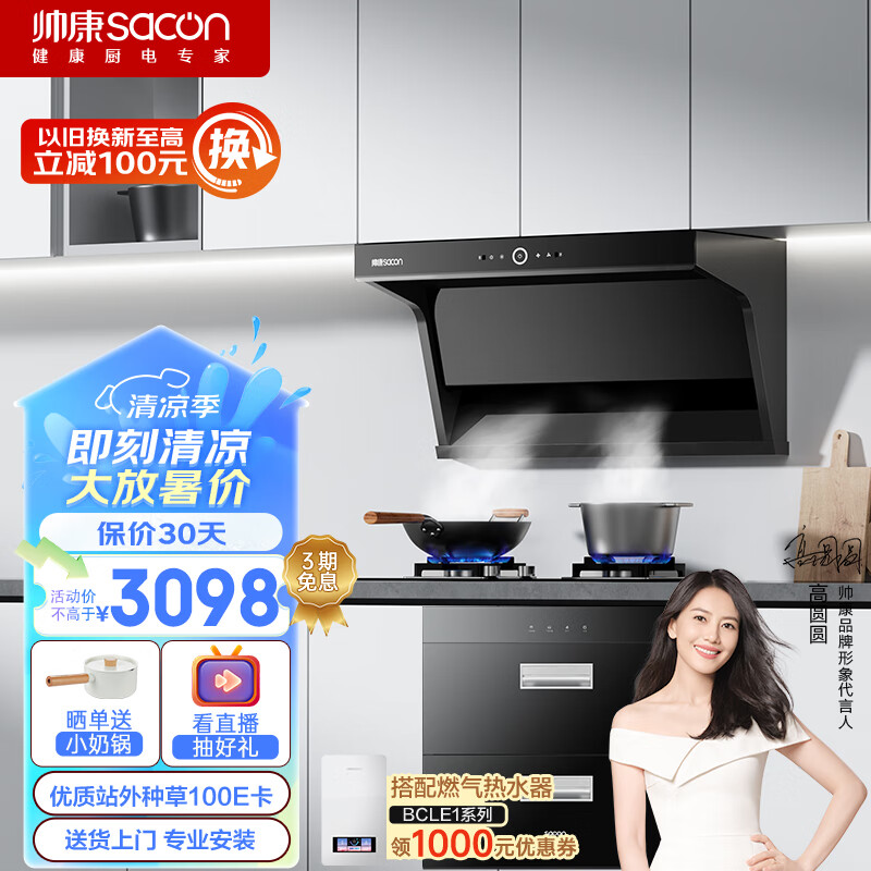 帅康(Sacon)烟灶消三件套 23大吸力顶侧双吸油烟机搭配5kW大火力灶具二消毒柜套装 Y8272+61B天然气+DS1价格:3098.00元!