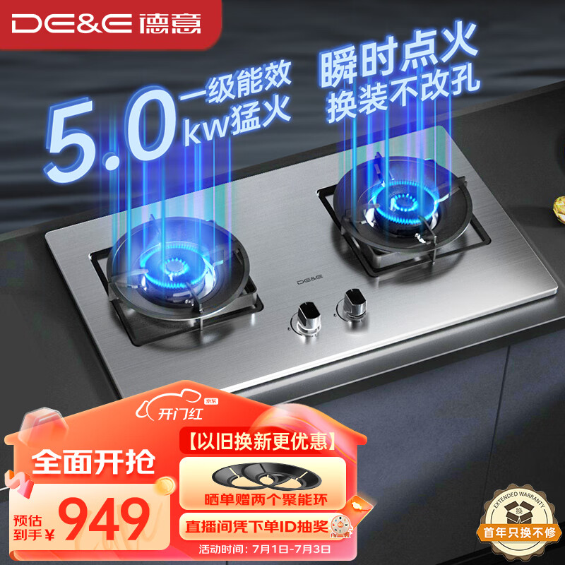 德意(DE&E)燃气灶 天然气 不锈钢 双眼灶具 5.0kW大火力 高热效率 全尺寸适配嵌入式灶具JZT-716G价格:949.00元!