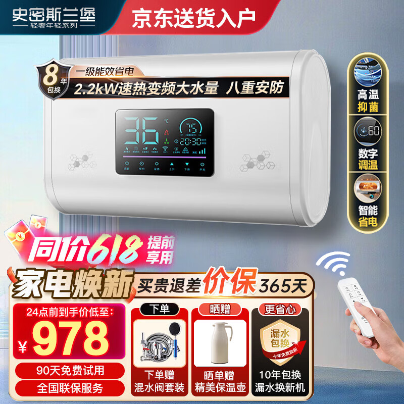 史密斯兰堡储水式电热水器100升扁桶家用洗澡沐浴2200W遥控定时预约变频电脑款出水断电一级能效DSZF-T07Y100价格:978.00元!