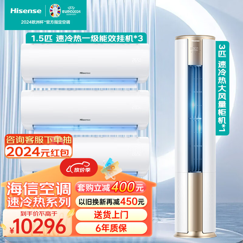 海信(Hisense)速冷热空调套装 三室一厅 新一级能效变频超大风量客厅柜机卧室家用挂机(1.5匹*3+3匹)价格:10296.00元!