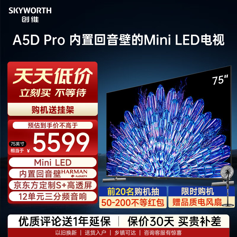 创维(Skyworth)电视75A5D Pro 电视75英寸 内置回音壁的Mini LED S+高透屏 144Hz高刷 4+64GB 4K高清语音屏价格:5599.00元!