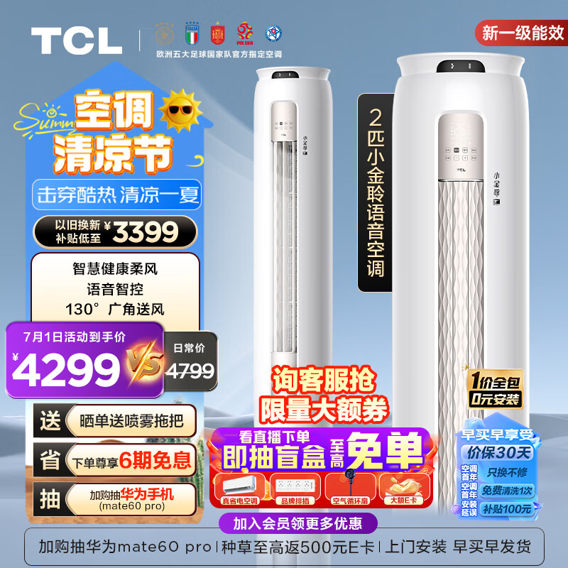 TCL空调2匹新一级能效变频冷暖 小金聆 语音智能 空调立式 空调柜机KFR-51LW/RT7Ga+B1一价全包价格:4080.00元!