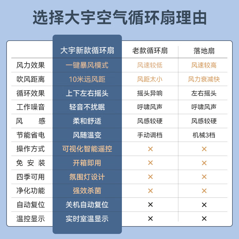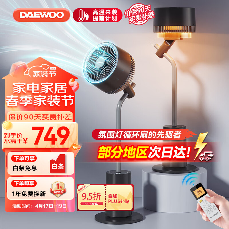 大宇(DAEWOO)【落地氛围灯】杀菌空气循环扇12档立式电风扇轻柔音直流变频柔风小型落地空调扇F30PRO黑价格:779.00元!