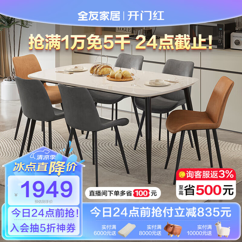 全友家居 餐桌耐用岩板台面长条桌餐厅稳固金属框架吃饭桌子DW1179价格:2784.29元!