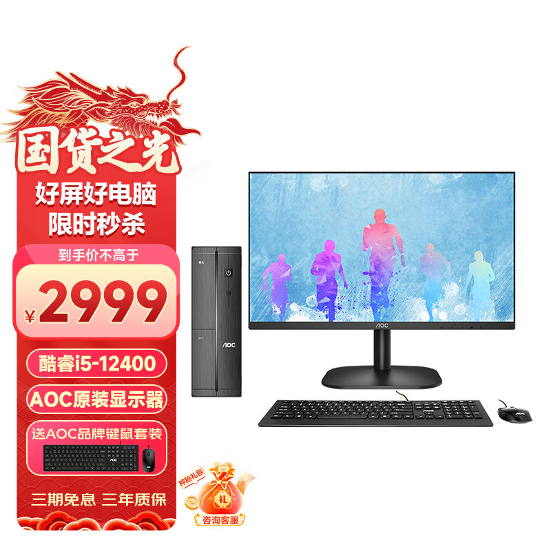 AOC显示器电脑套装电脑台式机整机主机(12代i5-12400 16G 512G 商务键鼠 三年上门)27英寸价格:2999.00元!