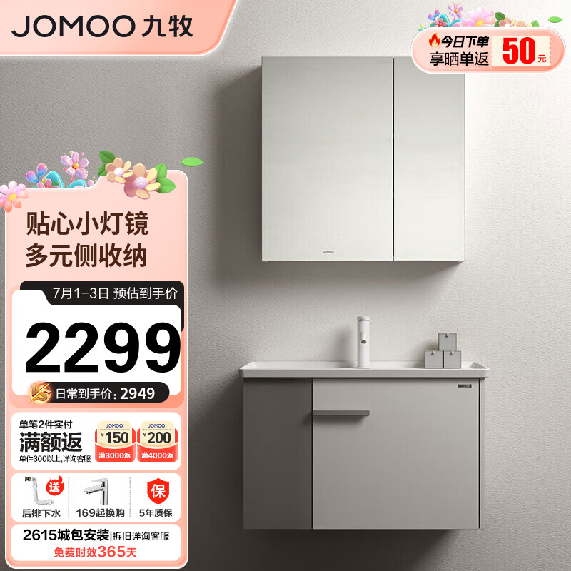 九牧(JOMOO)浴室柜陶瓷一体盆奶油风洗脸盆柜组合左侧收纳80cm A2717-147H-1价格:2599.00元!