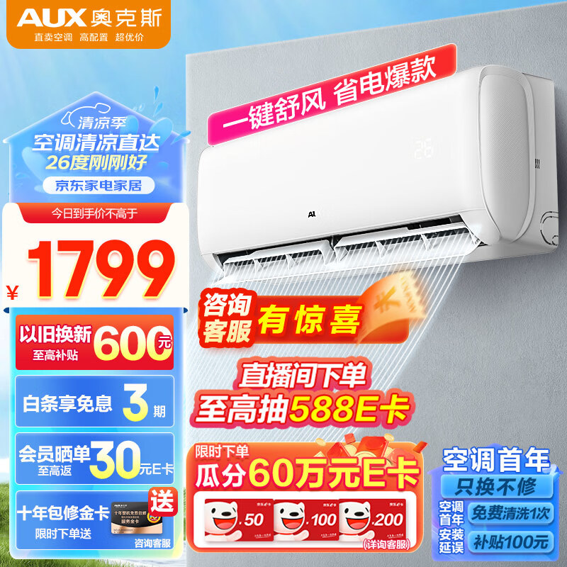 奥克斯(AUX)单冷空调 大1匹 新3级能效 挂机卧室 一键舒风 30秒速冷KF-26GW/BpR3AQG1(B3)价格:1627.90元!