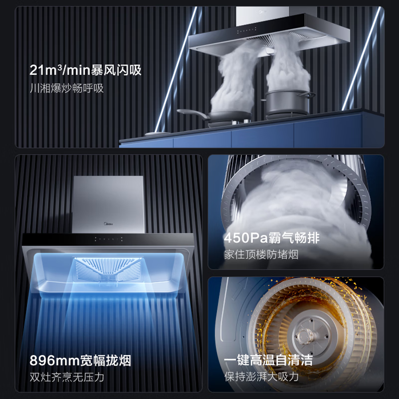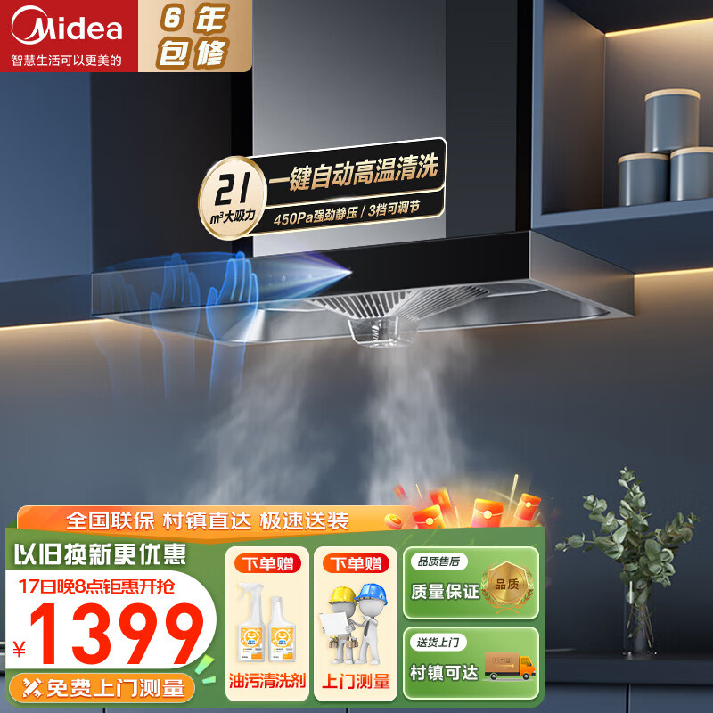 美的(Midea)抽油烟机家用爆炒21立方大吸力顶吸脱排油烟机欧式烟灶套装自清洗触屏吸油烟机 以旧换新 挥手智控 21吸力高温自清洗TP31 智能家电价格:1399.00元!