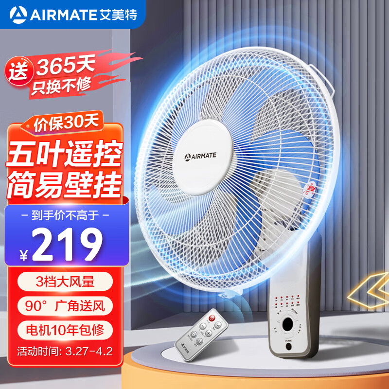 艾美特(Airmate)壁扇壁挂电风扇 家用商用挂壁式挂墙式五叶远程遥控3档大风量宿舍餐厅墙壁风扇FW4035R价格:219.00元!