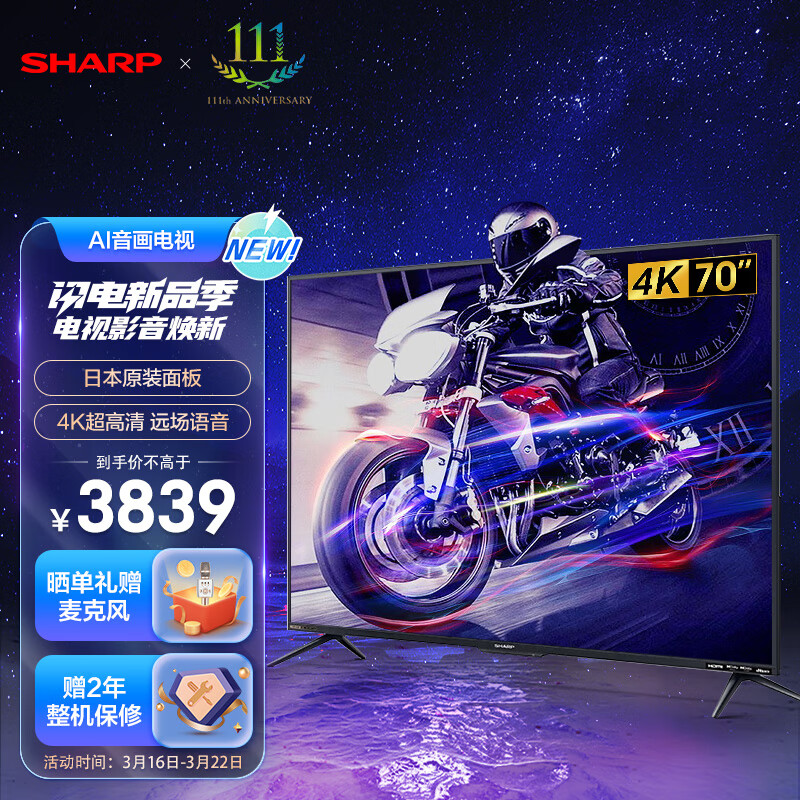 SHARP夏普电视4T-M70H9EA 70英寸4K超高清液晶原装面板AI远场语音3+32G一键投屏云游戏运动补偿平板电视价格:3819.00元!