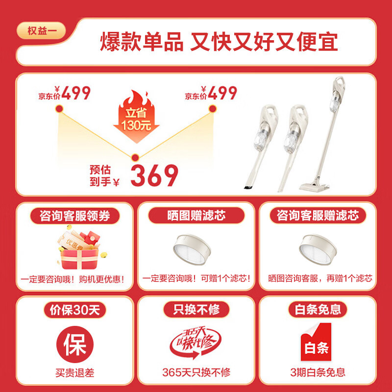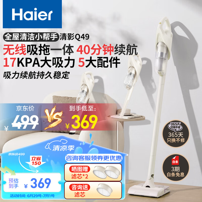 海尔(Haier)无线吸拖一体吸尘器家用轻量宠物便携式除尘机大功率大吸力干吸湿拖多用HZG-Q49W价格:399.00元!