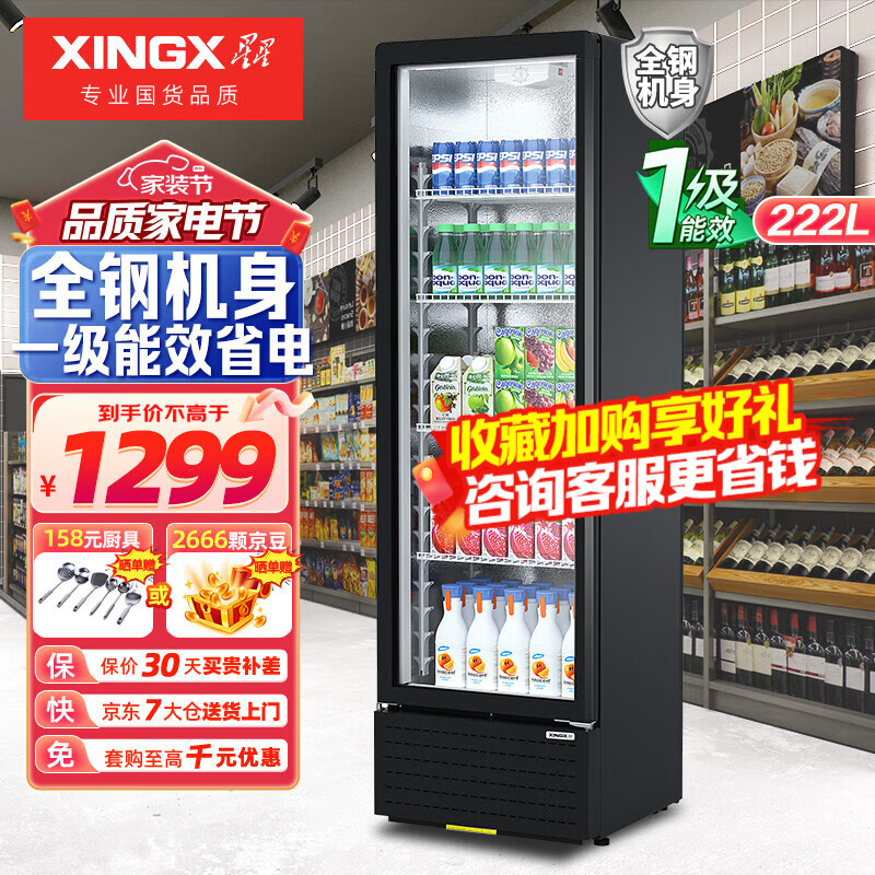 星星(XINGX)展示柜冷藏保鲜柜饮料展示柜单门商用立式冰柜1级能效超市便利店陈列柜啤酒水果柜 直冷丨1级能效丨222L丨230YPE价格:1299.00元!