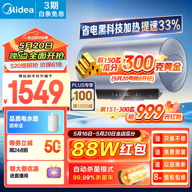 美的(Midea)储水式电热水器 免换镁棒3300W一级能效100L增容智能省电家用水质可视净水健康洗F10033-X3(HE)价格:1649.00元!
