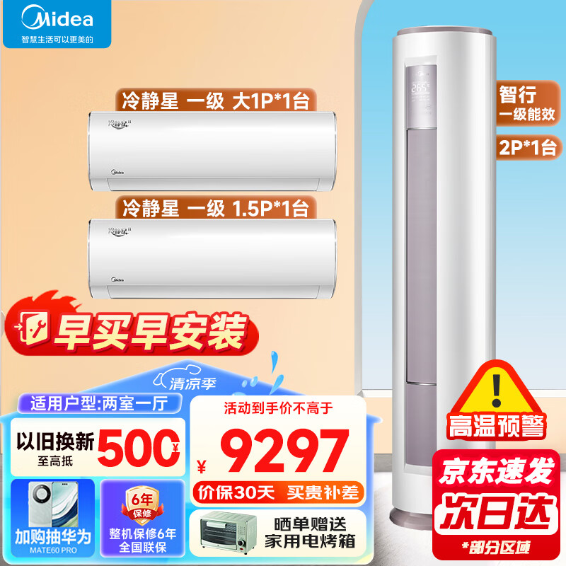 美的(Midea)空调套装两室一厅 一套购齐 新一级能效 变频冷暖 2匹智行柜机+冷静星挂机(1.5匹+大1匹)价格:9297.00元!