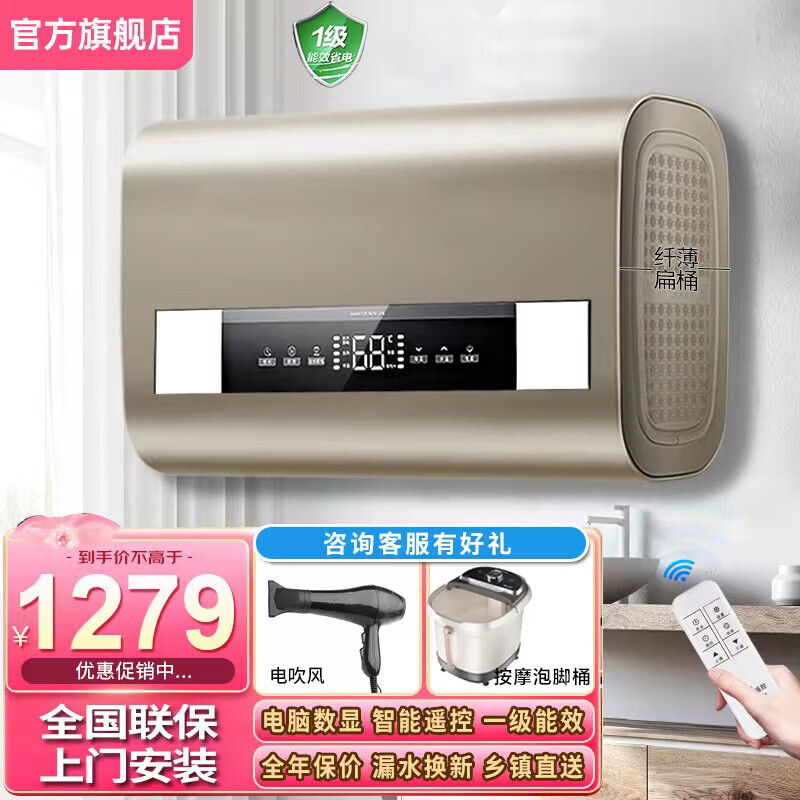 樱花雪储水式扁桶型80升电热水器 卫生间洗澡一级能效超薄双胆9倍增容节能省电出水断电DSZF-AD80价格:1198.00元!