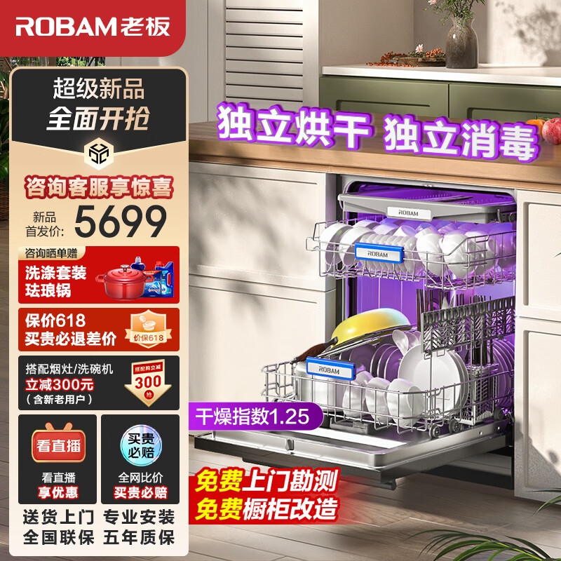 老板(Robam)B66D理想型17+1套三层嵌入式洗碗机大容量独立热风烘干独立紫外消毒家用洗碗机免费橱改价格:5698.00元!