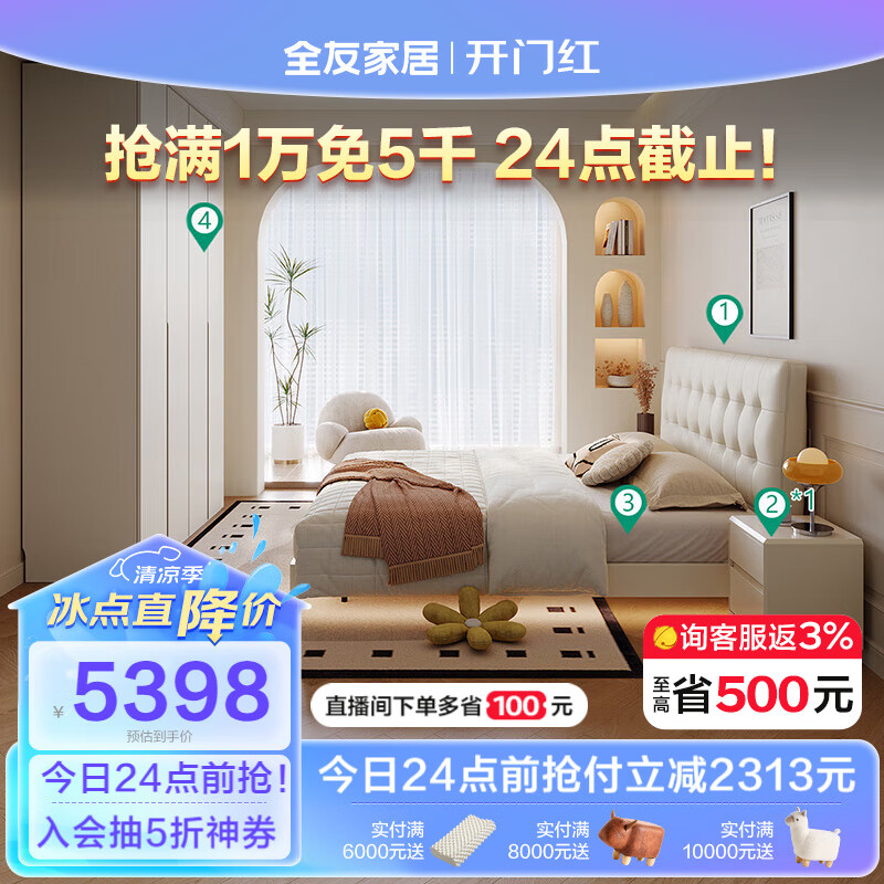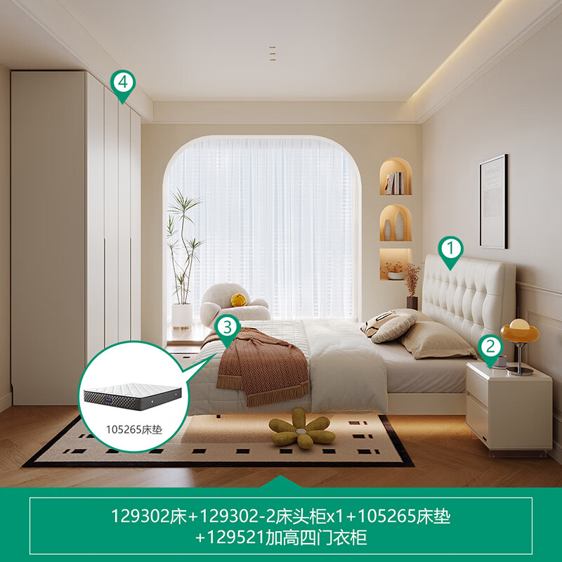 全友家居 时尚卧室4件套 云朵悬浮床椰丝棉床垫四门衣柜带床头柜价格:7711.43元!