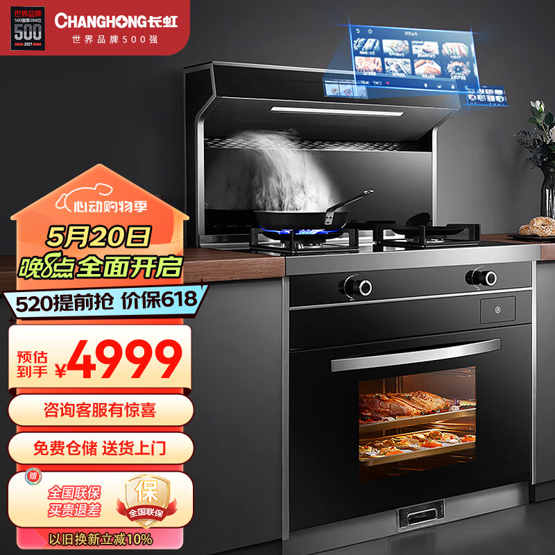 长虹集成灶蒸烤一体灶直流变频25m3大吸力侧吸油烟机保洁柜套装 智能彩屏蒸箱烤箱一体机 A8K天然气价格:4999.00元!