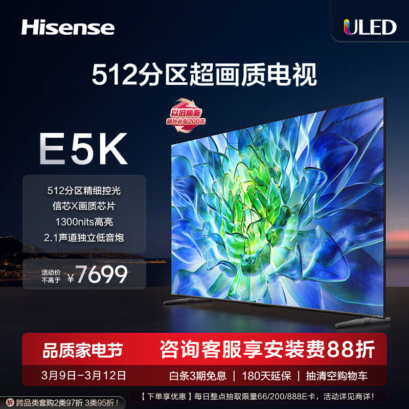 海信电视85E5K 85英寸 ULED 512分区 1300nit 4K 144Hz超高清智慧屏 液晶智能平板电视机价格:7843.02元!