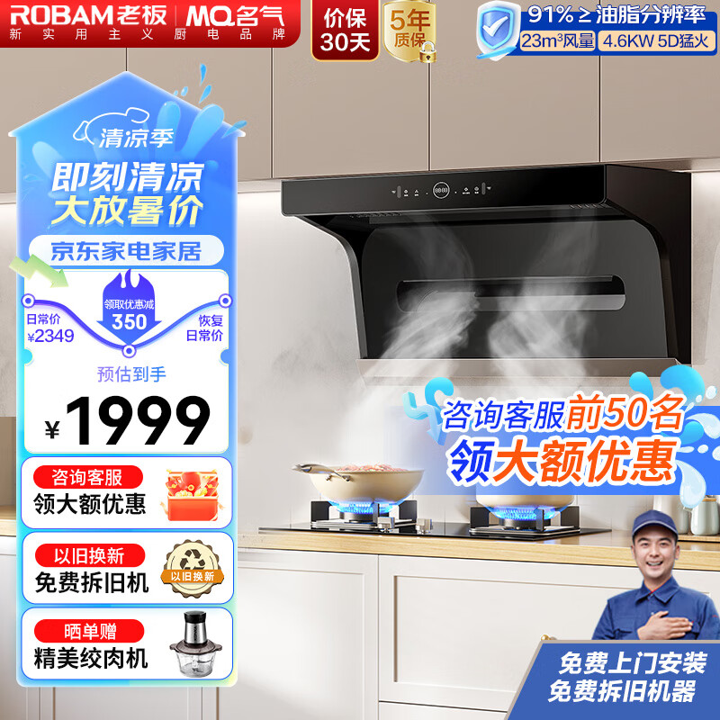 名气(MQ)老板抽油烟机吸油烟机 顶侧双吸烟灶套装 23m3大风量 4.6KW换新灶双灶 A5505+B320A 天然气价格:1999.00元!