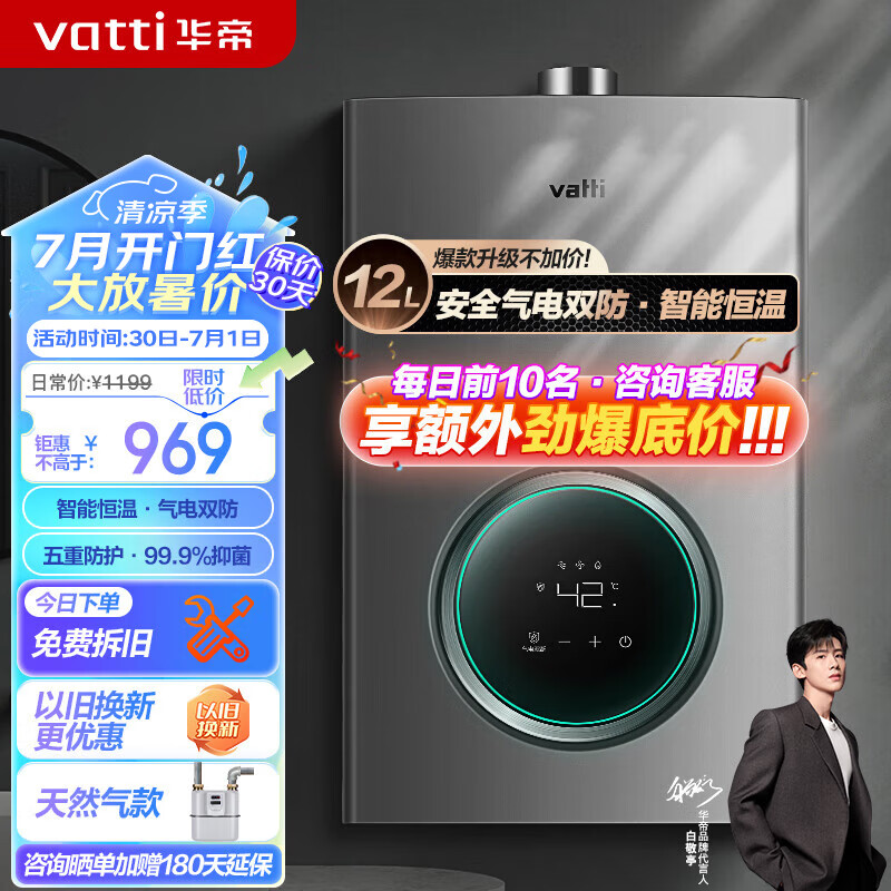 华帝(VATTI)燃气热水器 气电双断防护 水伺服级恒温强排 即热式热水器 防燃气泄漏保护 大升数低压启动 i12103 12L 天然气【一厨一卫】价格:969.00元!