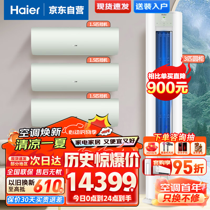 海尔(Haier)空调套装劲爽除醛版 新一级能效变频节能 家用冷暖空调柜机 挂机三室一厅套装以旧换新价格:14399.00元!
