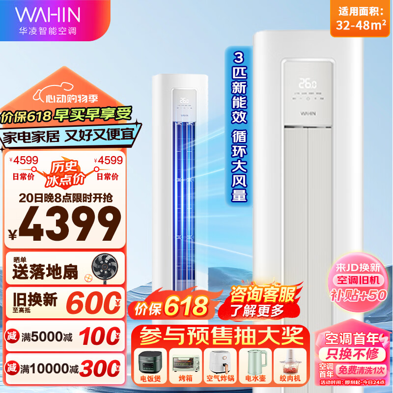 华凌空调3匹柜机小冰棒新三级能效变频冷暖省电立式客厅防直吹柜机升级款以旧换新KFR-72LW/N8HA3II价格:4399.00元!