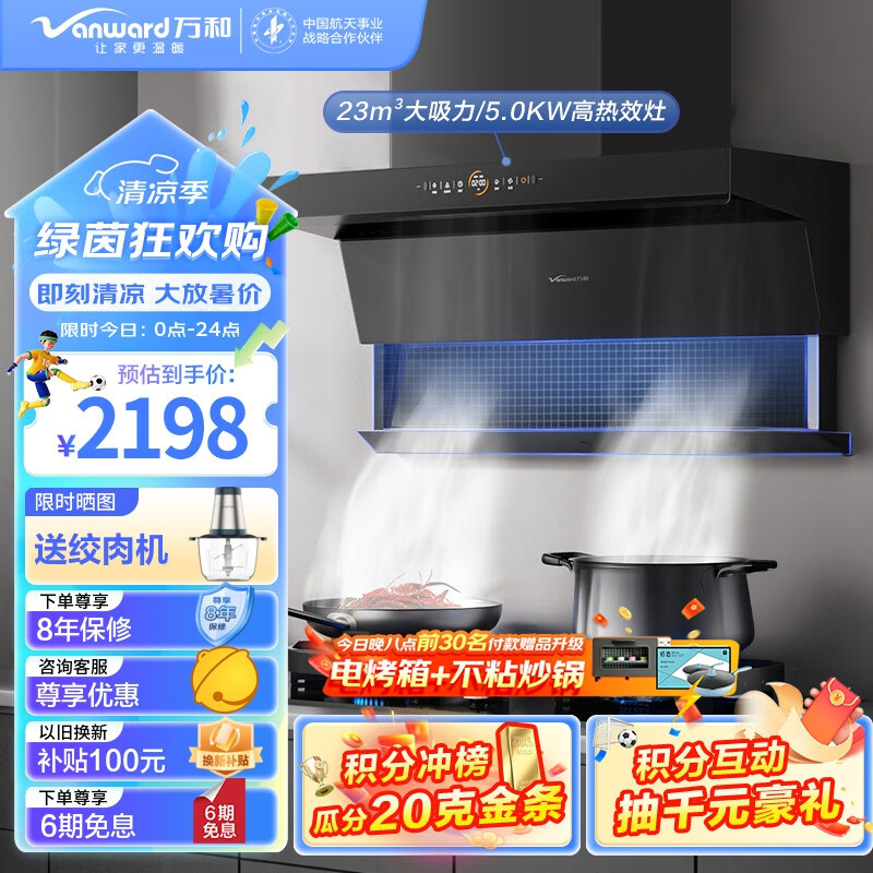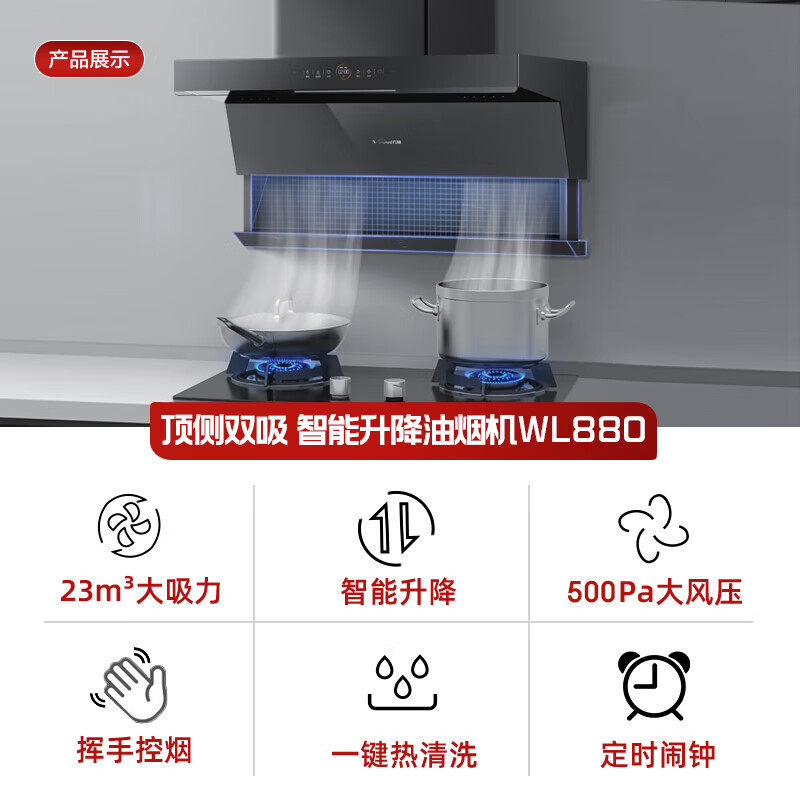 万和(Vanward)顶侧双吸升降家用抽油烟机 燃气灶具烟灶套装 23立方大吸力 智能升降 WL880+G6L50(天然气)价格:2198.00元!