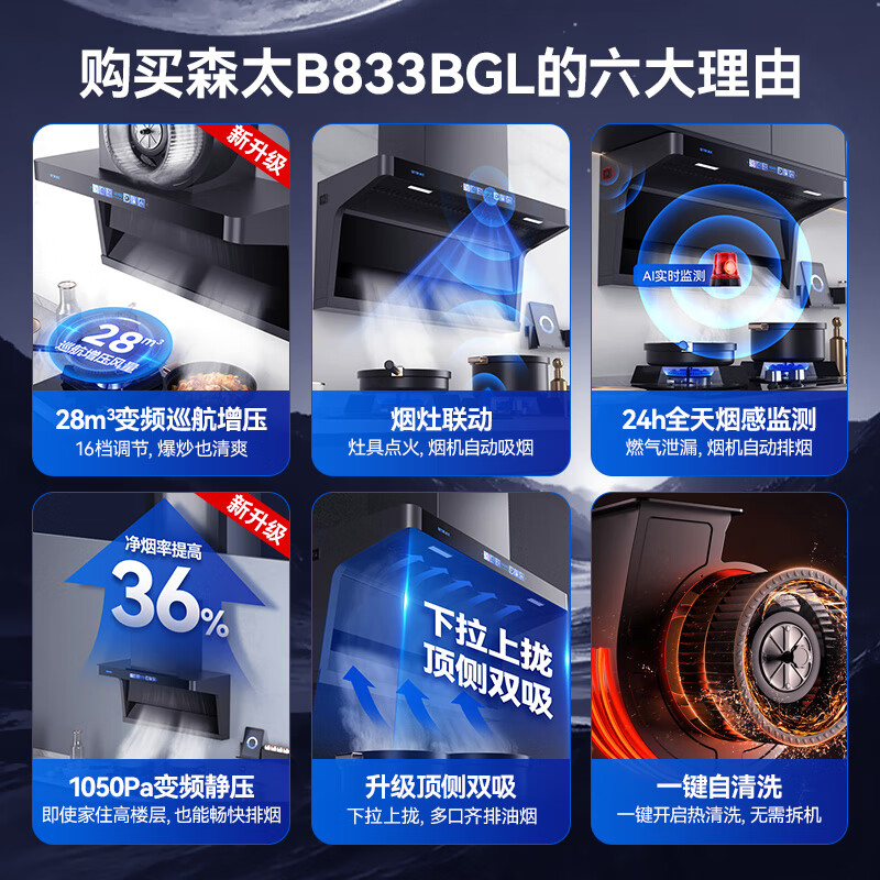森太(SETIR)顶侧双吸油烟机 7字型抽油烟机 1050Pa变频烟灶联动厨房家用自动清洗吸油烟机 CXW-220-B833BGL价格:1399.00元!
