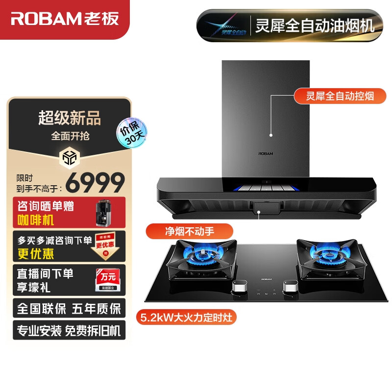 老板(Robam)灵犀全自动抽油烟机欧式顶吸双腔变频25大风量家用燃气灶吸油烟机灶具套装63A3S+51B0A天然气价格:6999.00元!