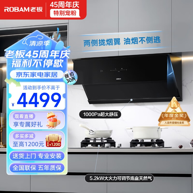 老板(Robam)抽油烟机探索家D3S家用大吸力三面拢变频烟机燃气灶具烟灶套装23风量吸油烟机28D3S套装(天然气)价格:4499.00元!