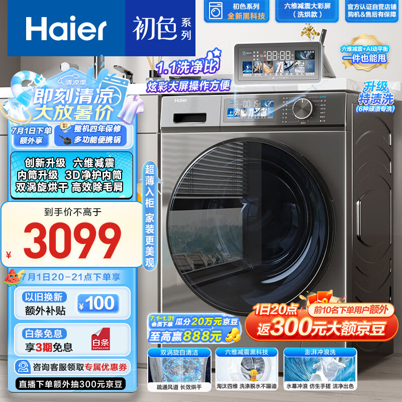 海尔(Haier)滚筒洗衣机全自动 初色系列 洗烘一体机 EG100H65S 以旧换新 超薄家用带烘干 10公斤大容量内衣洗价格:3099.00元!