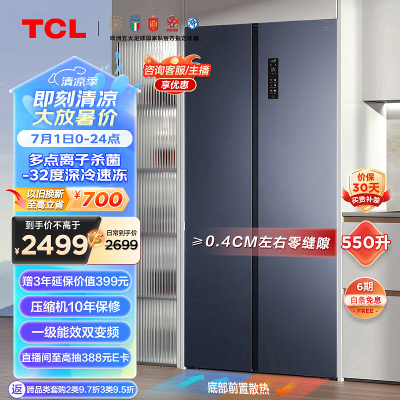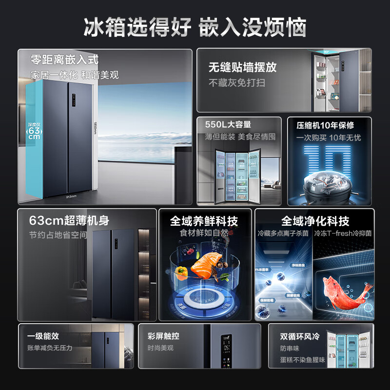 TCL 超薄零嵌系列550L大容量双开对开门冰箱超薄嵌入式家用冰箱一级变频底部散热双循环R550T9-SQ价格:2799.00元!