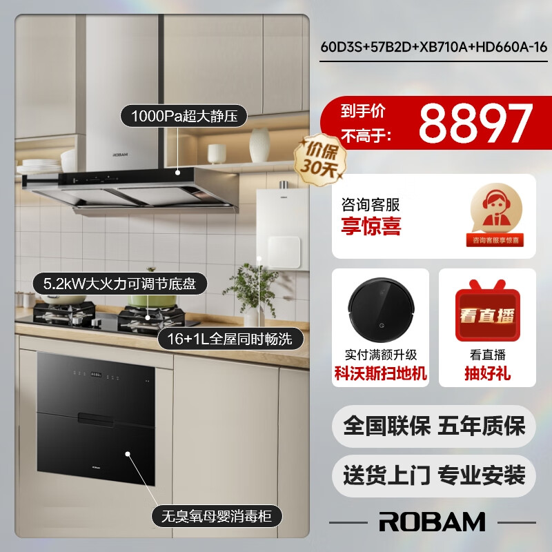 老板(Robam)抽油烟机厨房多件套欧式双腔变频24风量燃气灶燃气热水器消毒柜60D3S+57B2D+XB710A+HD660A-16价格:9197.00元!