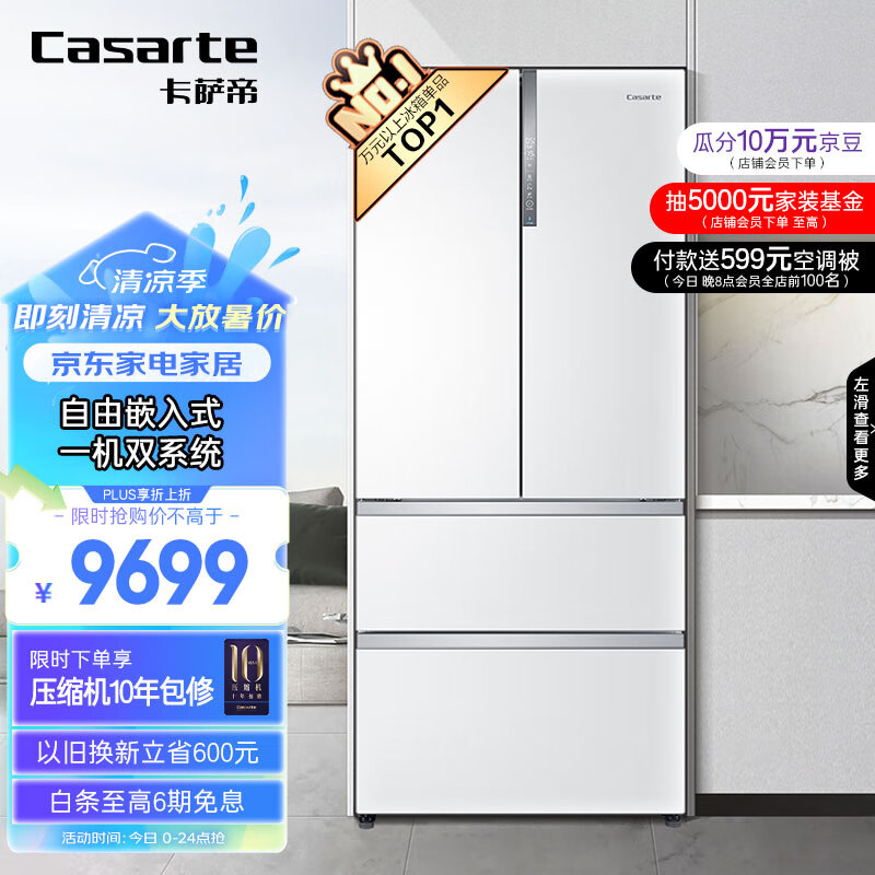 卡萨帝(Casarte)555升纯白系列超薄法式多门四开门超大容量自由嵌入式一级能效家用白色冰箱BCD-555WDGAU1价格:9699.00元!