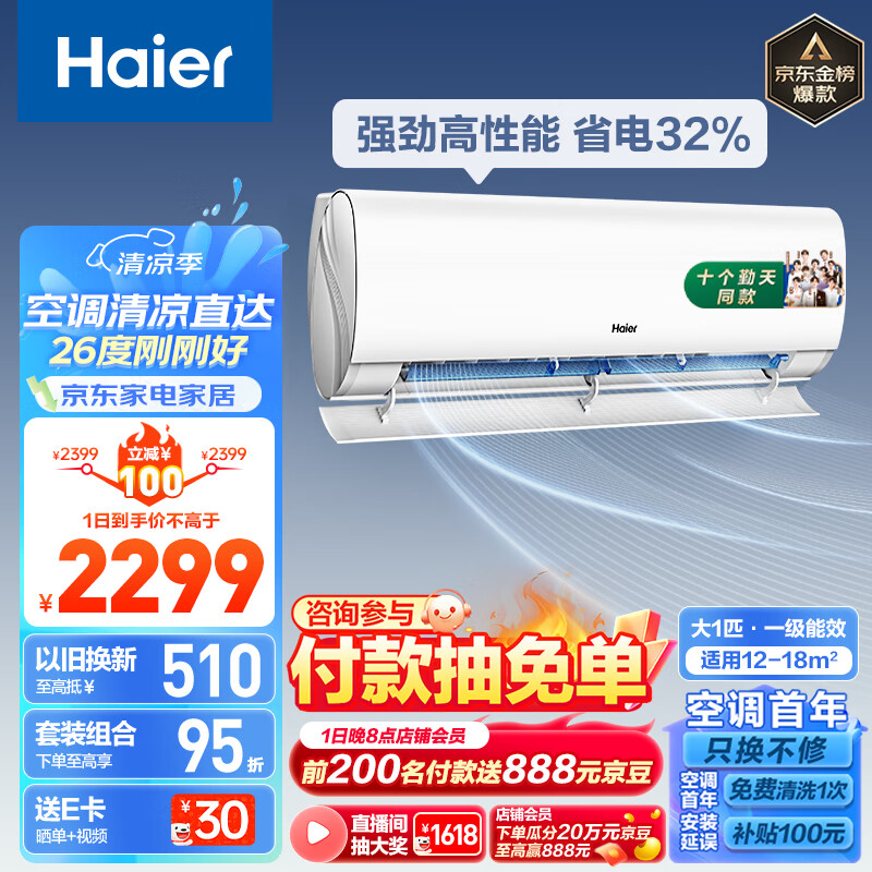 海尔(Haier)劲爽 大1匹新一级变频 冷暖 壁挂式空调挂机 卧室空调 冷媒变流 KFR-26GW/B5LAA81U1以旧换新价格:2299.00元!
