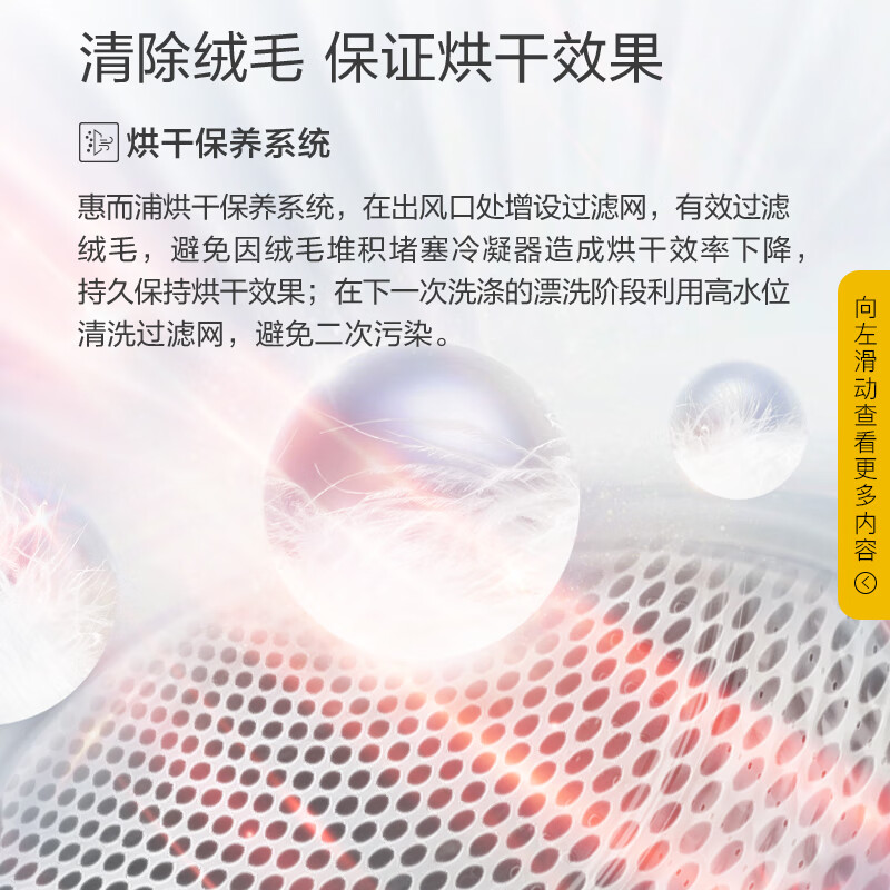1、外形外观:外形设计风格非常大气耐看洗净效果:洗衣机回来后试洗了两次还是非常不错的容量大小:容量10KG非常大比我想象的内桶要大家里以前7KG大了不止一圈除菌效果:除菌效果非常好洗衣机刚到因为着急自己安装的,非常简单,客服非常耐心的给讲解每一个功能静音效果比我想象的好多了放在阳台和卧室一墙之隔感觉还是特别安静的在这价位的洗烘一体机有绒毛收集器的只有惠而浦了