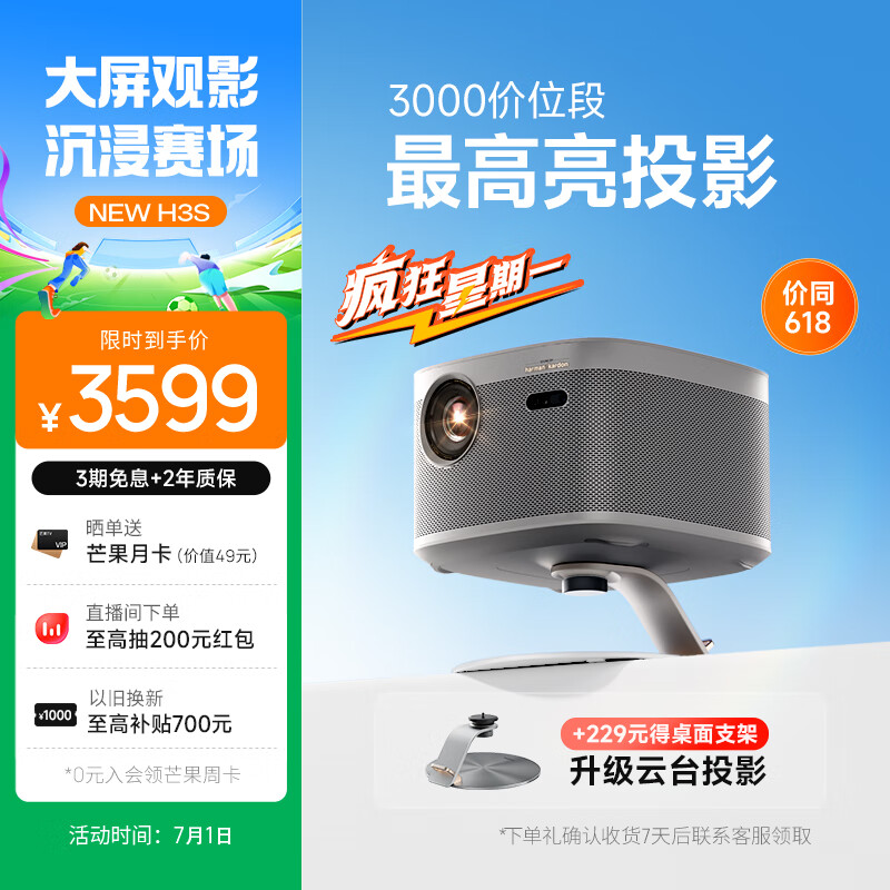 极米NEW H3S 投影仪家用 投影机 智能家庭影院(1500CVIA 哈曼专利音响 MT9669旗舰芯片 极米2年全保)价格:3699.00元!