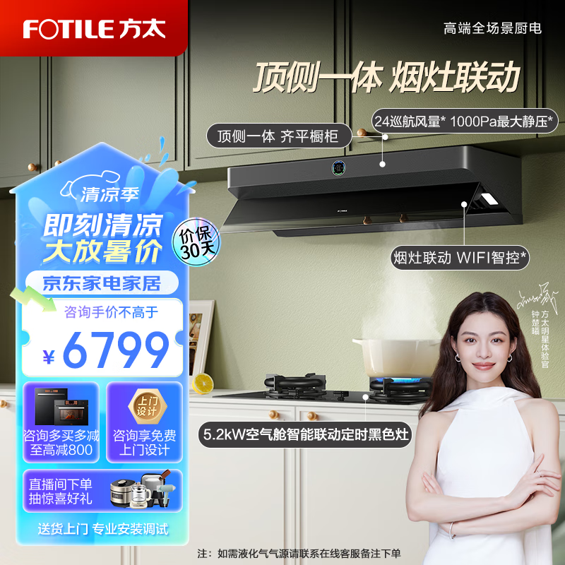 方太(FOTILE)F2抽吸油烟机灶具套装 顶侧一体齐平橱柜 24巡航风量 智能定时免看管烟灶联动套餐01-F2.i+TE21价格:6799.00元!