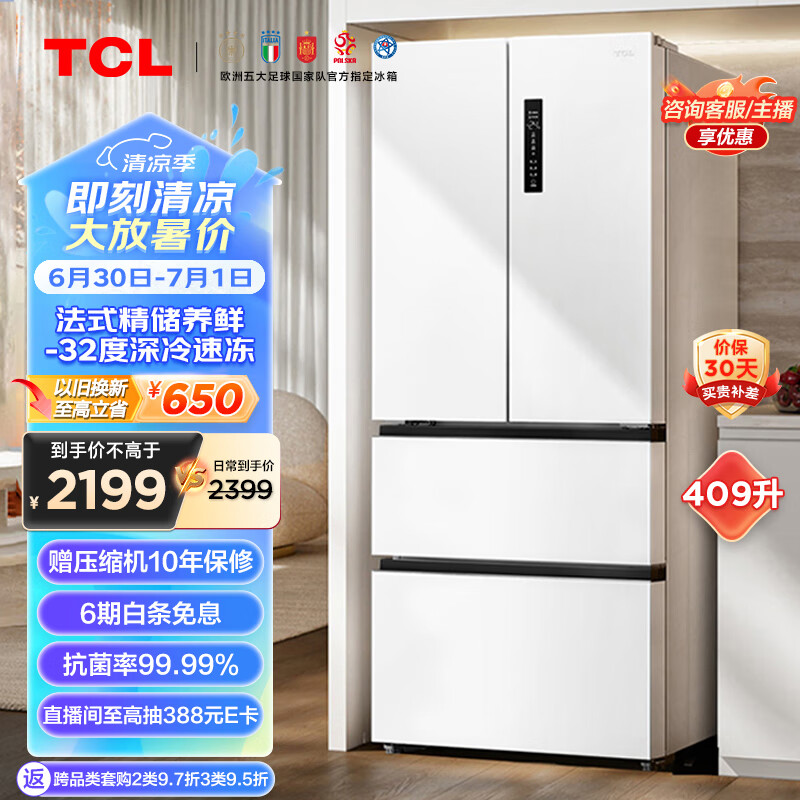 TCL 409升白色法式多门四开门对开门家用电冰箱风冷无霜一级能效双变频智慧变温空间深冷速冻R409V5-D价格:2199.00元!