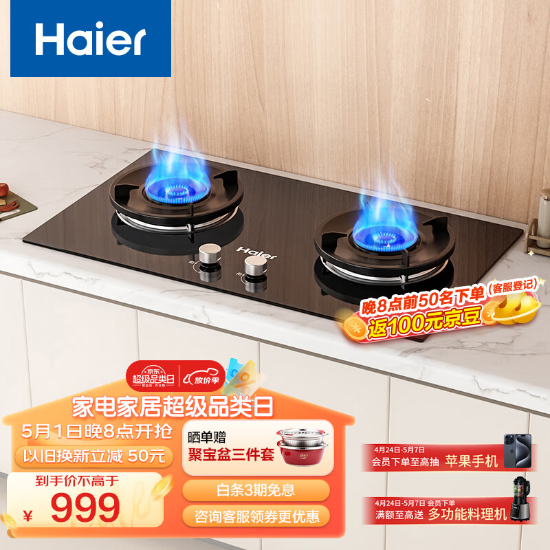 海尔(Haier)燃气灶天然气 灶具天然气灶家用 5.2kw蓝焰猛火 67%高热效聚能防风支锅架 可调节底壳Q2BEA(12T)价格:999.00元!