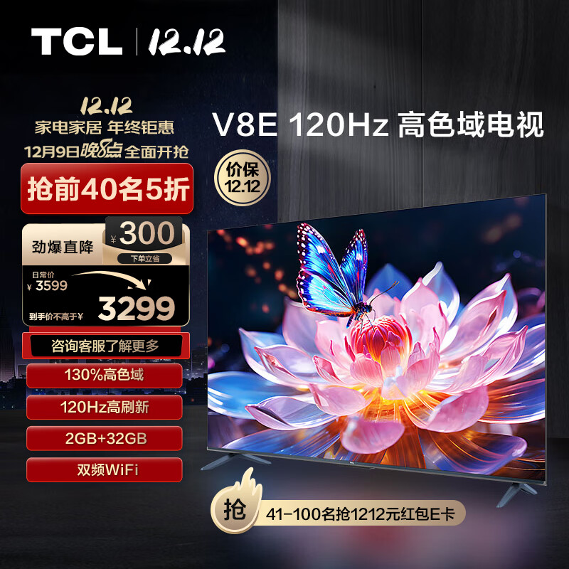 TCL电视 75V8E 75英寸 120Hz 高色域 2+32GB MEMC防抖大屏 4K高清 客厅液晶智能平板电视机排行前十名价格:2834.00元!