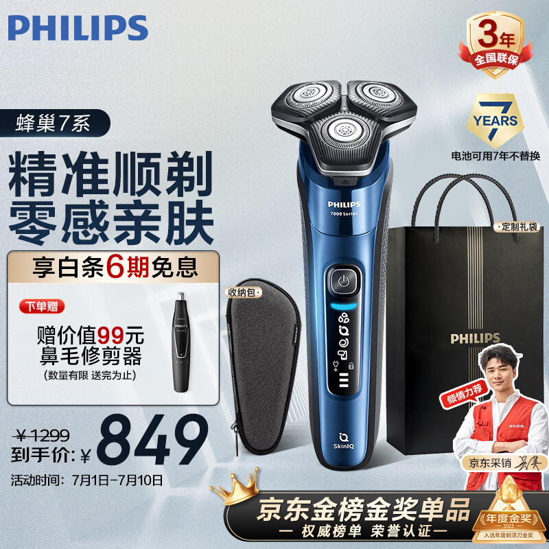 飞利浦(PHILIPS)电动剃须刀蜂巢7系 SkinIQ高端系列肌能感应护肤级刮胡刀 生日礼物 送男友 送老公价格:849.00元!