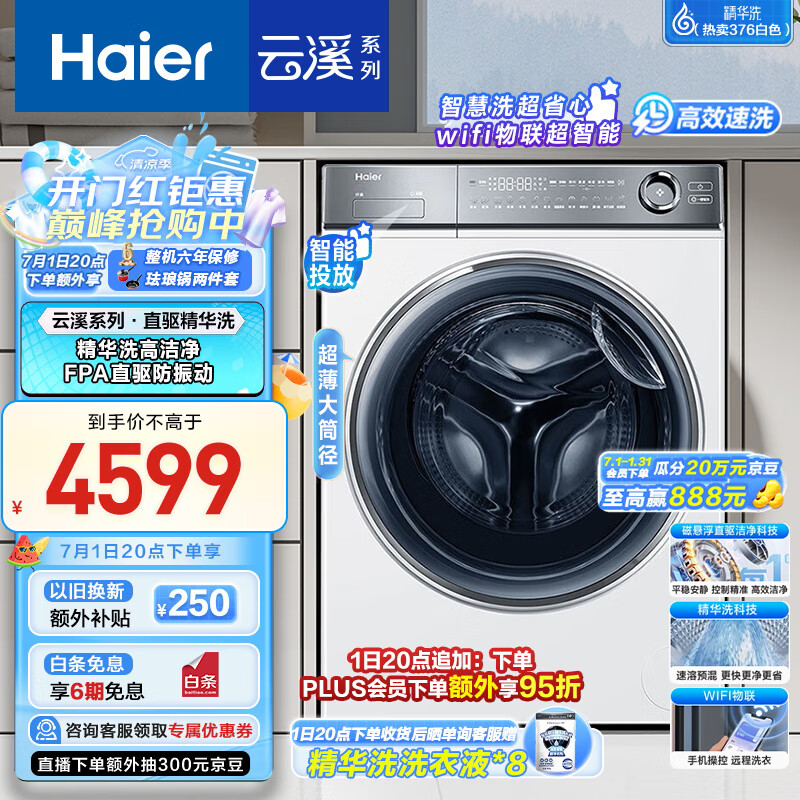 海尔(Haier)滚筒洗衣机全自动 云溪白376 10公斤大容量【直驱精华洗XQG100-BD14376LWU1】超薄家用 以旧换新价格:4599.00元!