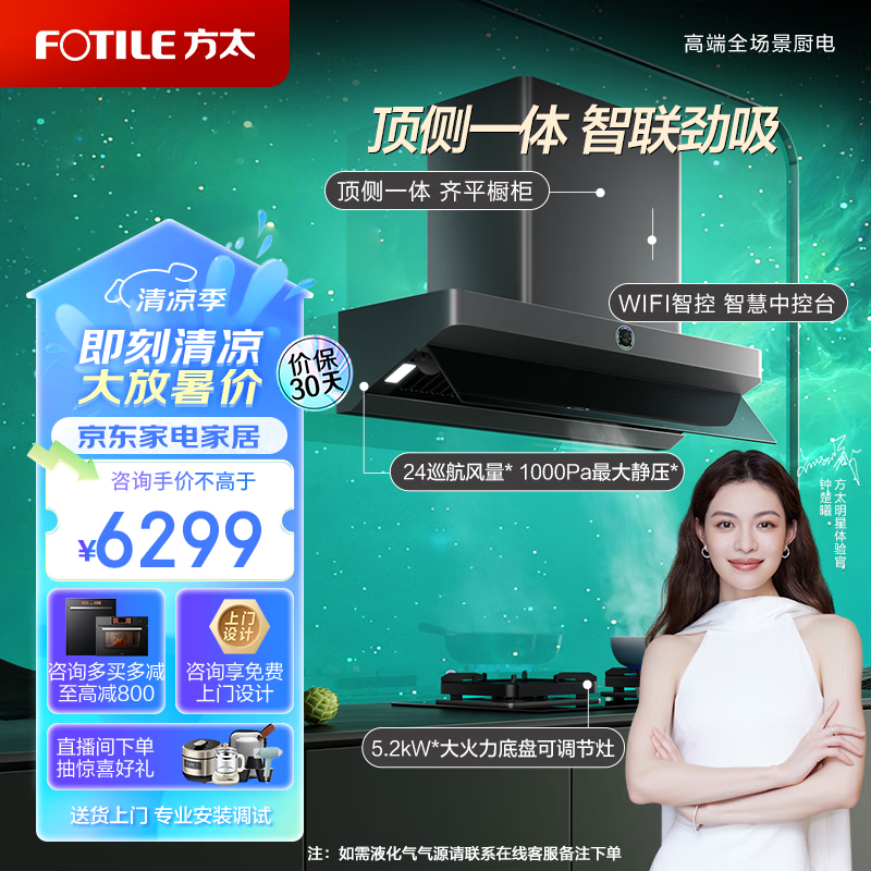 方太(FOTILE)F2抽吸油烟机灶具套装 顶侧一体欧式侧吸 变频烟灶24巡航风量5.2kW套餐01-F2.i+02-TH27B天然气价格:6299.00元!